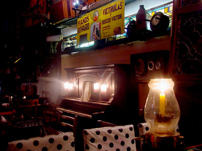 Pianos, mesas de casinos otros elentos antiguos componen la decoración de este boliche.